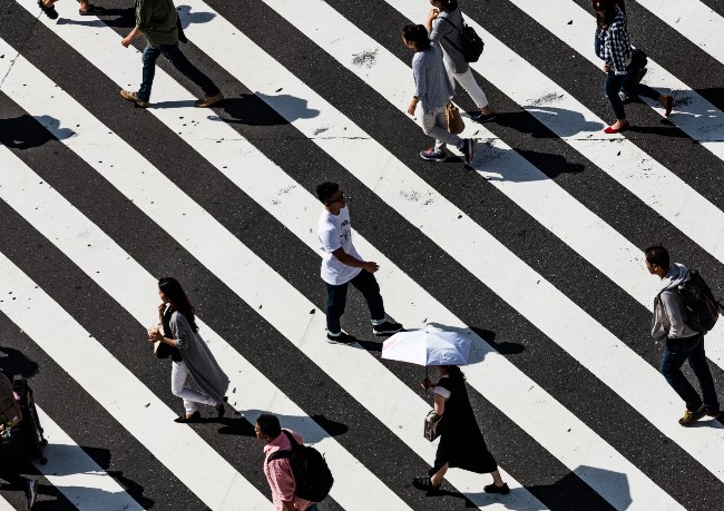 A train station in a major city. 8.30 a.m. The train pulls in, the doors open, and there bursts from within an enormous surge of suited bodies: churning rapids of grey and black.